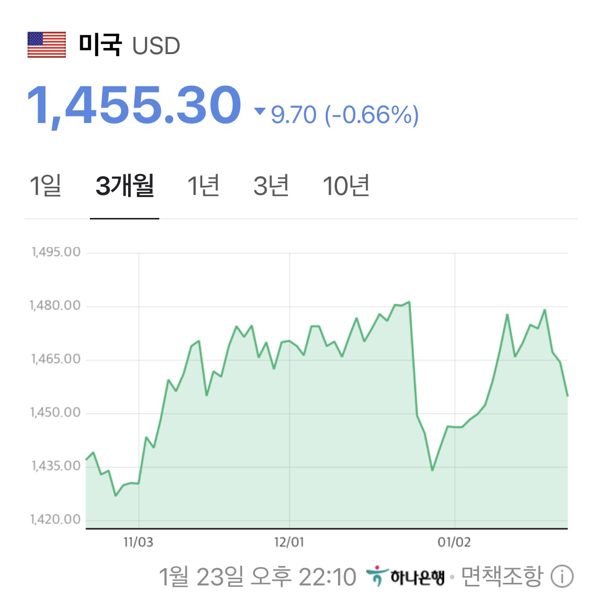 1,455원 수준으로 약 10원가량 하락했다.