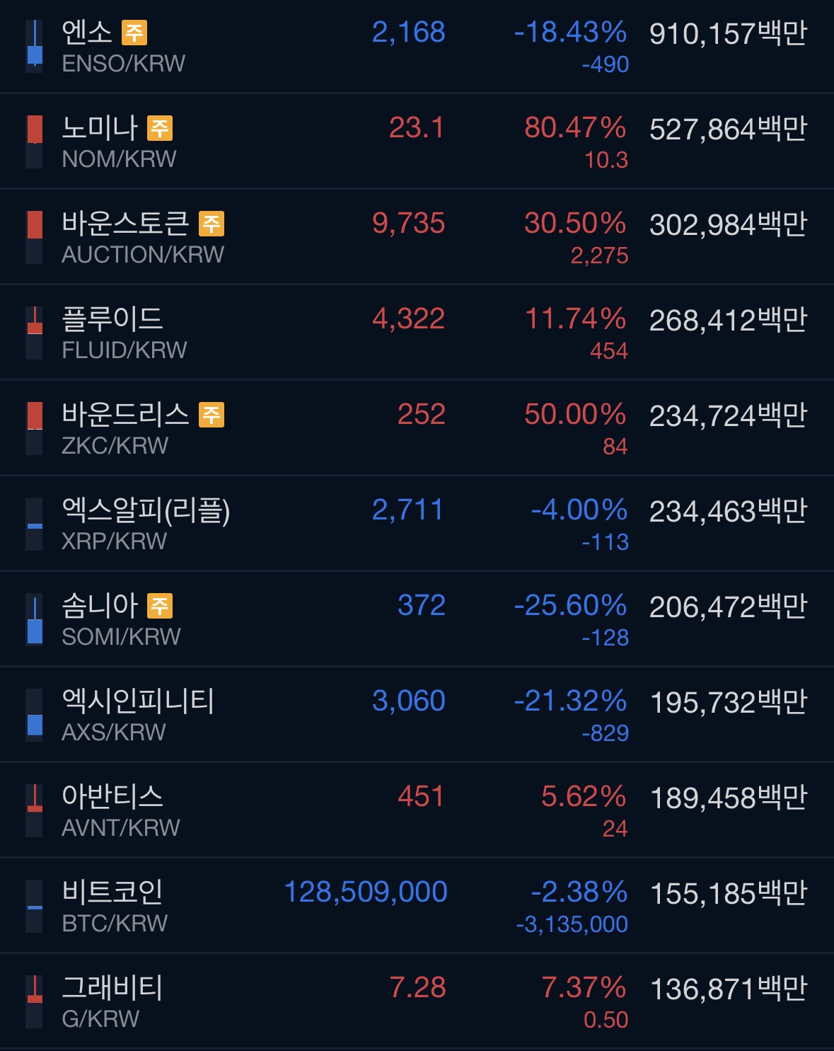 알트코인 대비 거래대금이 크게 밀리며, 박스권 하단을 다시 확인하러 내려오는 흐름이다.