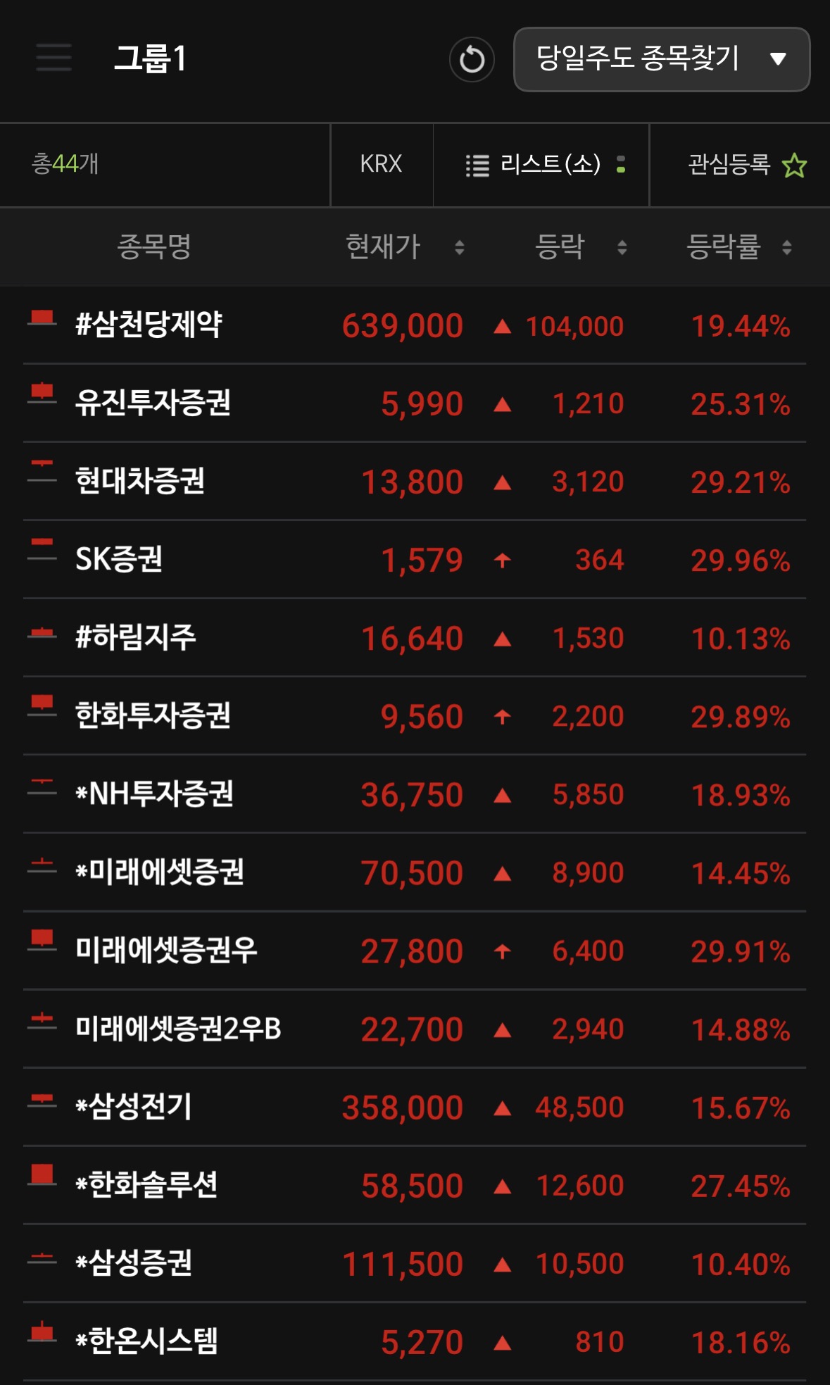 * 한화솔루션 (+27.45%), 현대차증권 (+29.21%), SK증권 (+29.96%) 등