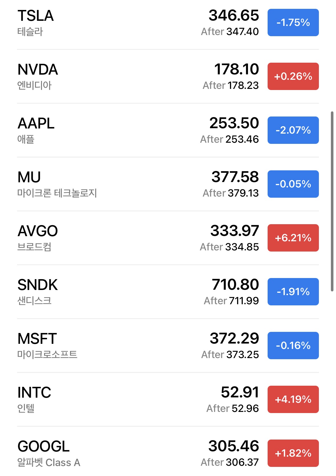 브로드컴(+6.21%), 인텔(+4.19%) 상승으로 반도체 섹터가 상대적으로 강세를 보임.