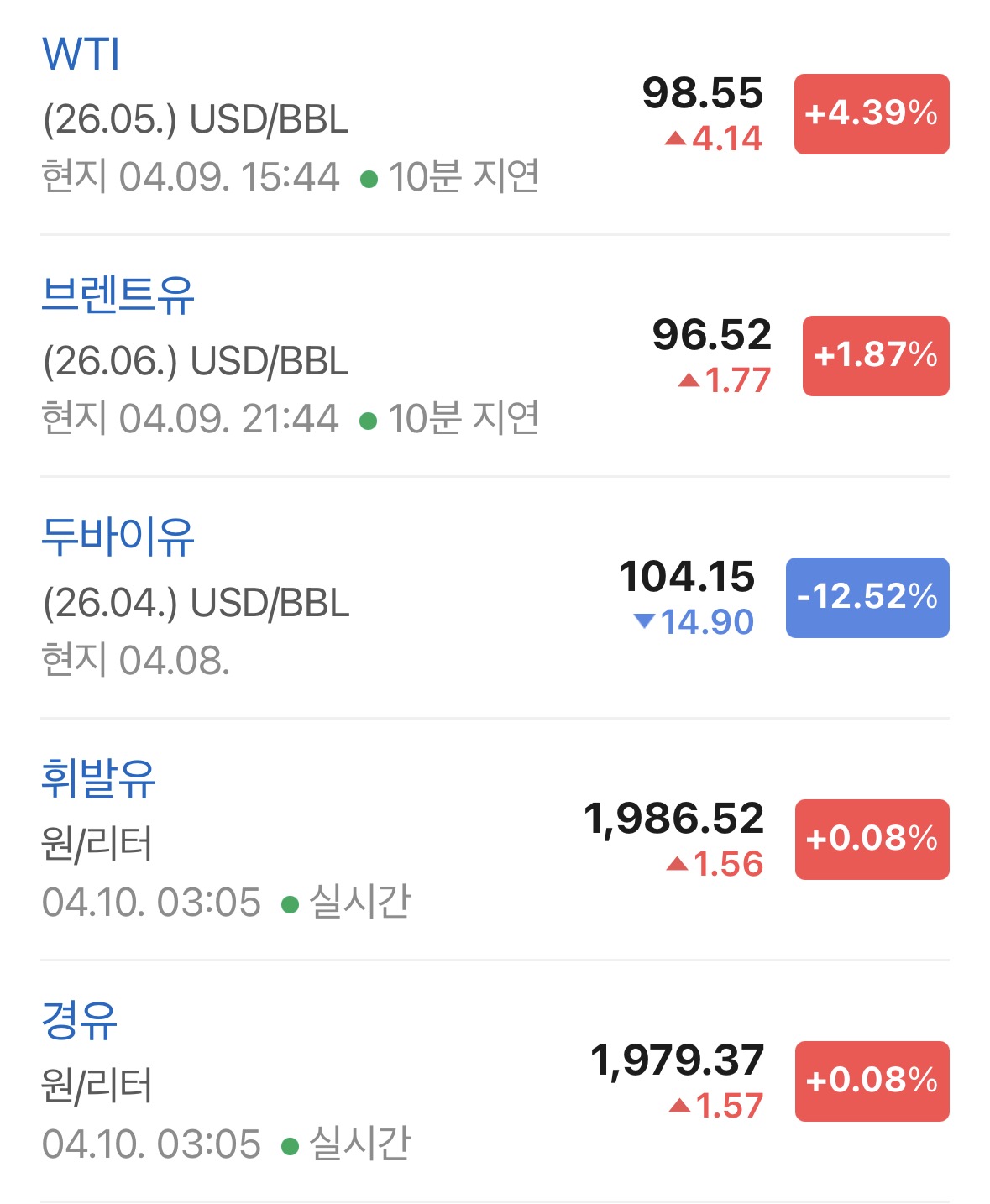 • 국제유가는 WTI 기준 98.55달러 (+4.39%) 상승.