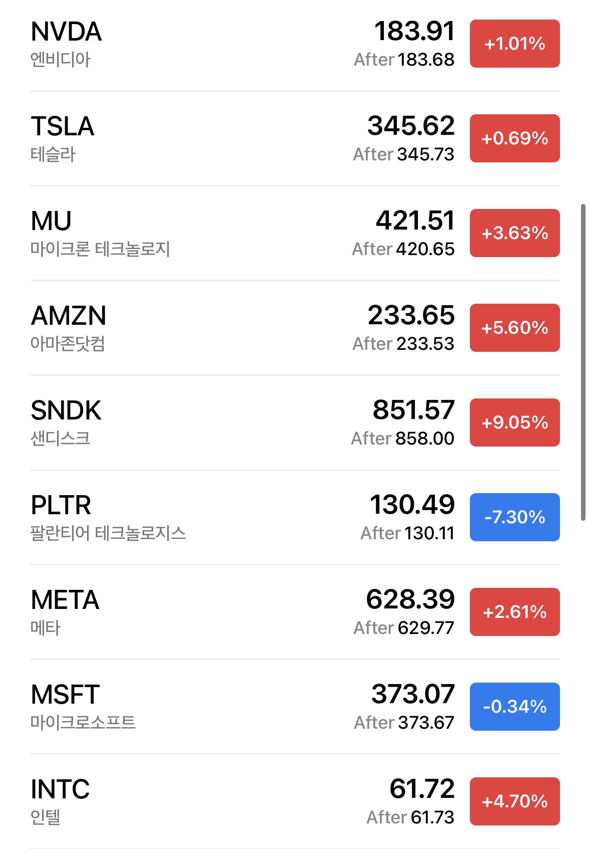 마이크론(+3.63%), 아마존(+5.6%), 샌디스크(+9.05%) 등 반도체 및 일부 빅테크는 강세를 보였으나,