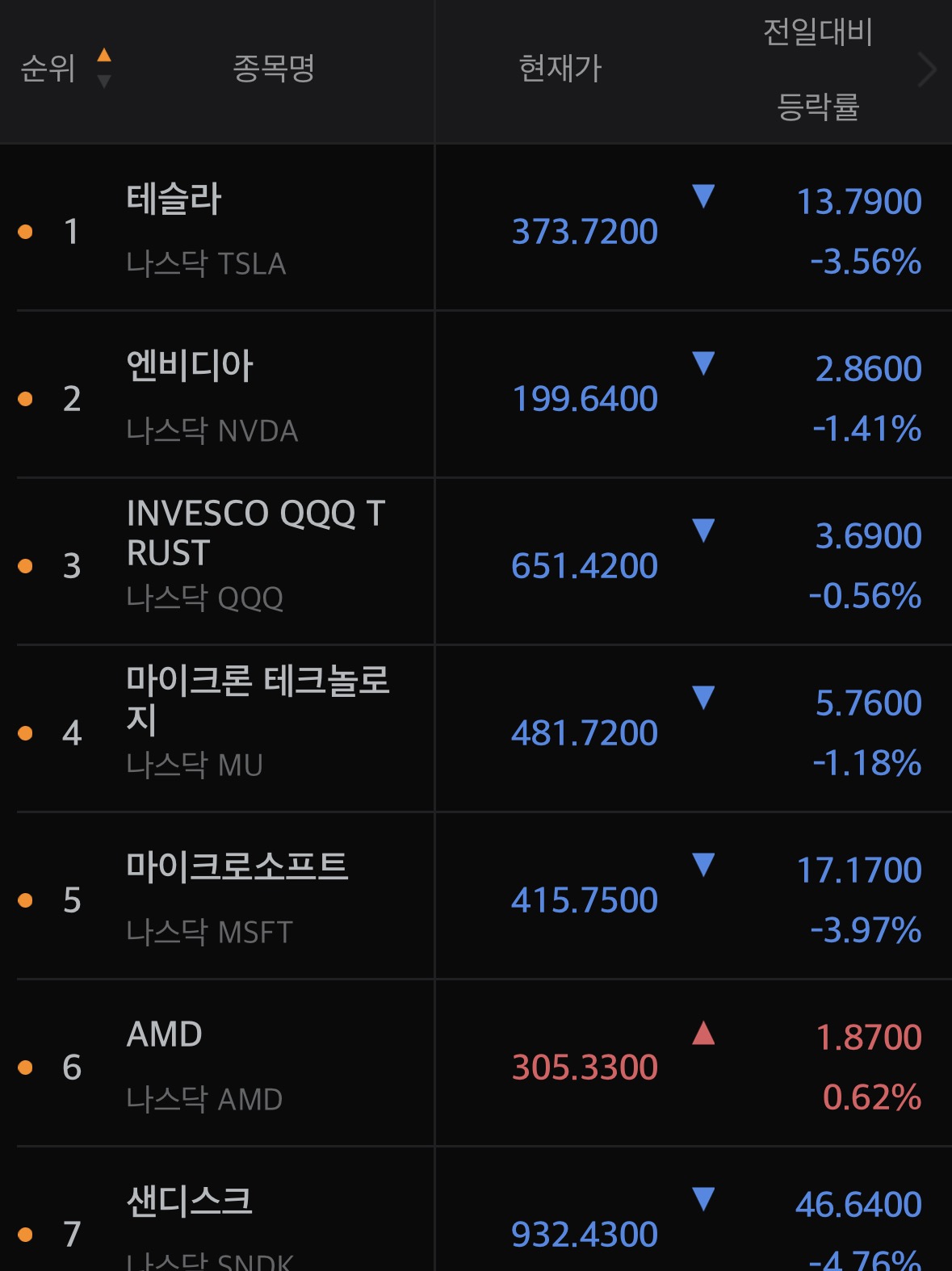 마이크로소프트는 -3.97%, 테슬라 -3.56%, 샌디스크 -4.76% 등 주요 기술주가 전반적으로 약세를 보임.