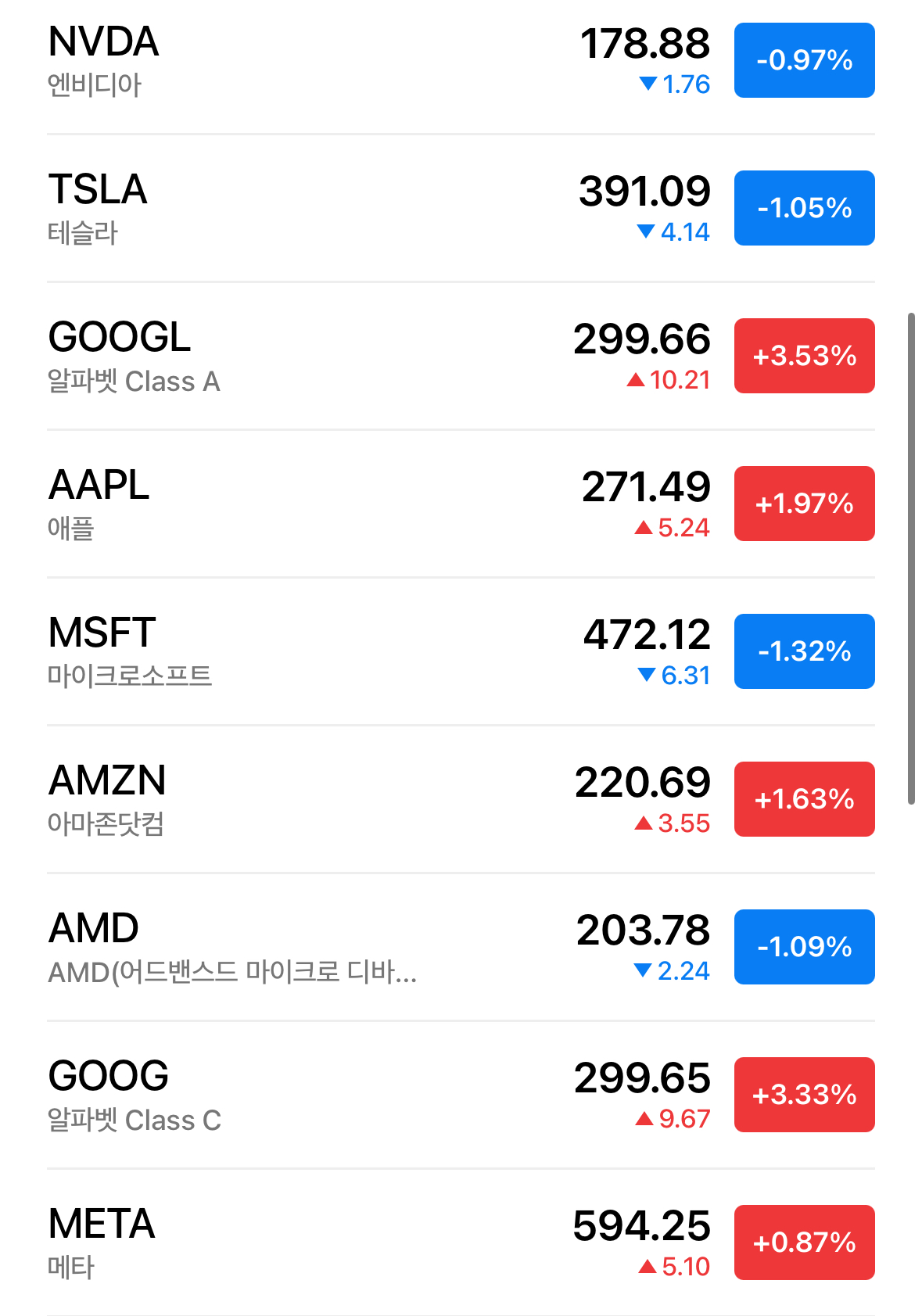 * 나스닥은 0.88% 상승으로 마무리됨. 알파벳은 3.53% 상승하였음. 대부분의 종목은 2%내외로 등락을 반복함.