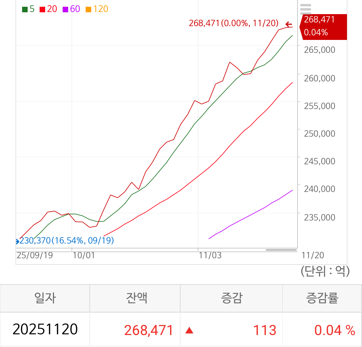 신용 잔고는 26.8조가 되면서 0.04% 상승하고 있음. 살짝 아리송한데 일단 상승은 멈춰보면서 지켜보는 듯.