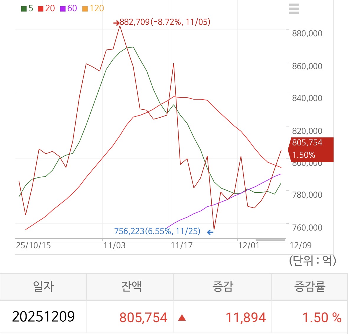 신용 잔고는 27.3조 가량으로 0.08% 하락이 기록됨. 거의 보합권의 움직임으로 5일선과 거리도 있고 횡보하는 모습.