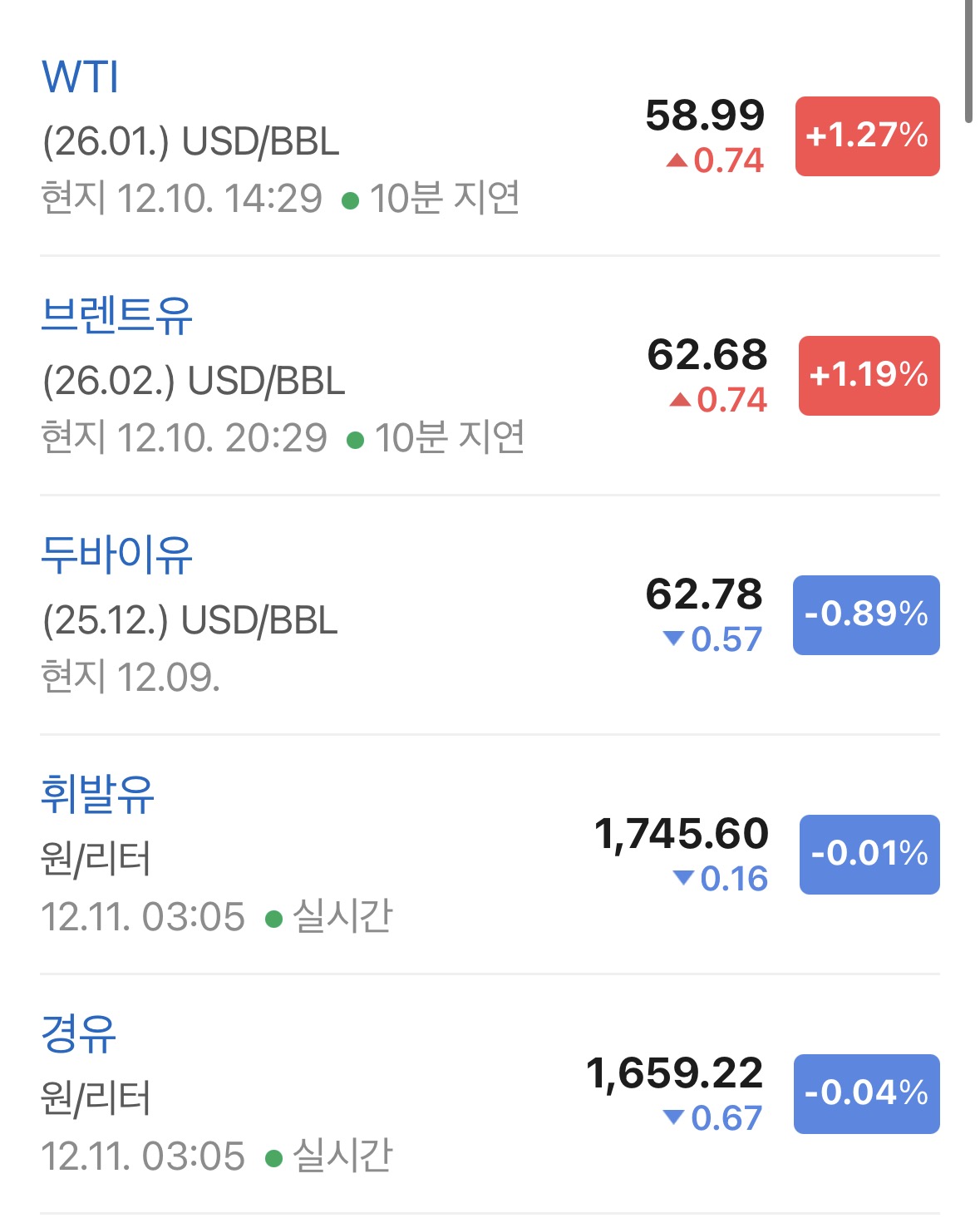 * 국제 유가는 상승하고 있음. 우크라이나가 여전히 종전협상이 불투명하다며 불안한 모습인 듯. WTI 기준으로 1.27% 상승하며 58.99달러가 됨.