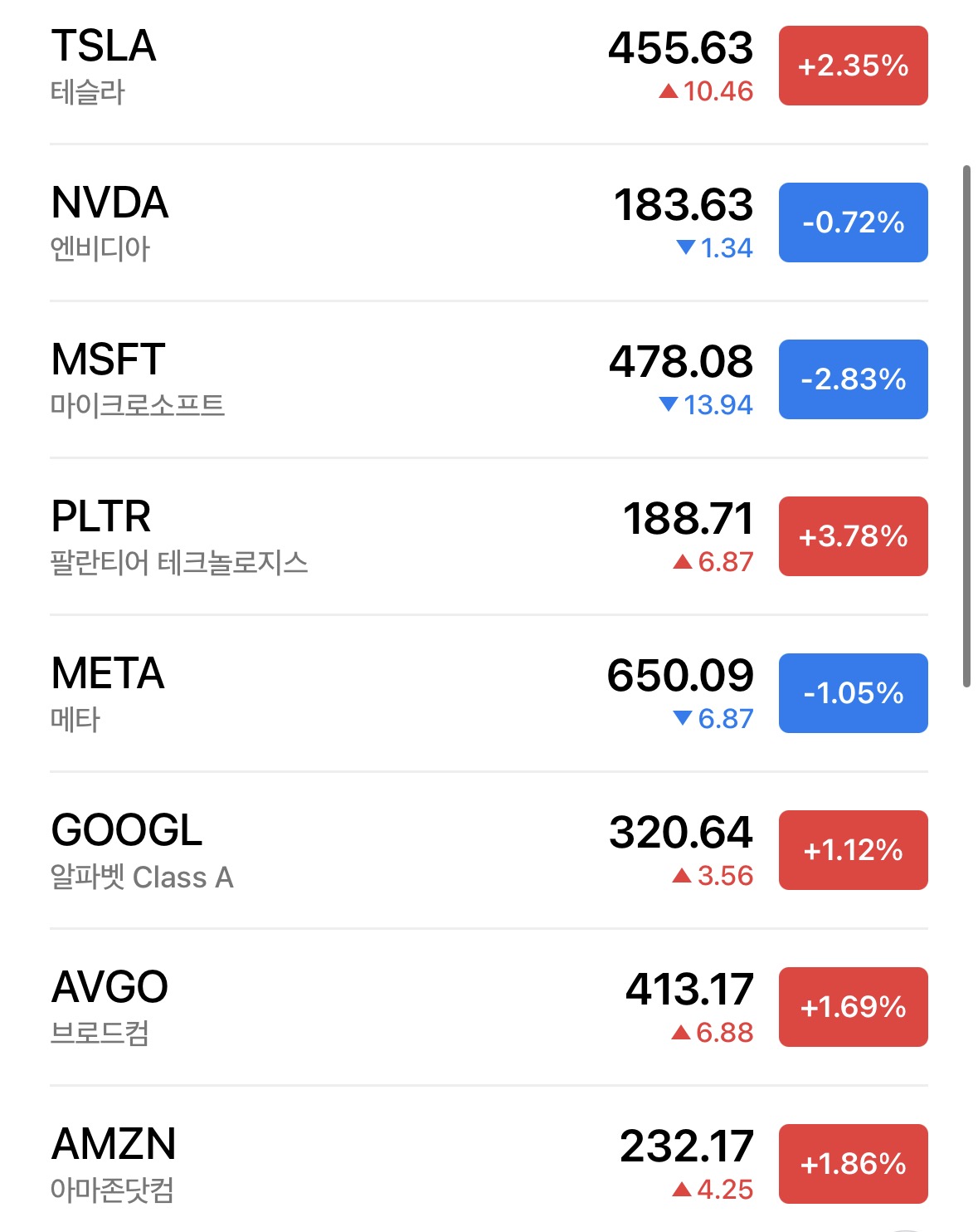 * 나스닥은 0.5% 상승 중. FOMC에서 금리 인하 0.25%가 나왔고 내년에도 금리 인하를 계속 할 계획이라는 말에 증시가 훈훈한 분위기. 팔란티어가 3.78% 오르며 테슬라도 2.35% 상승함. 마이크로소프트는 2.83% 떨어지며 분위기를 따라가지 못하는 모습.