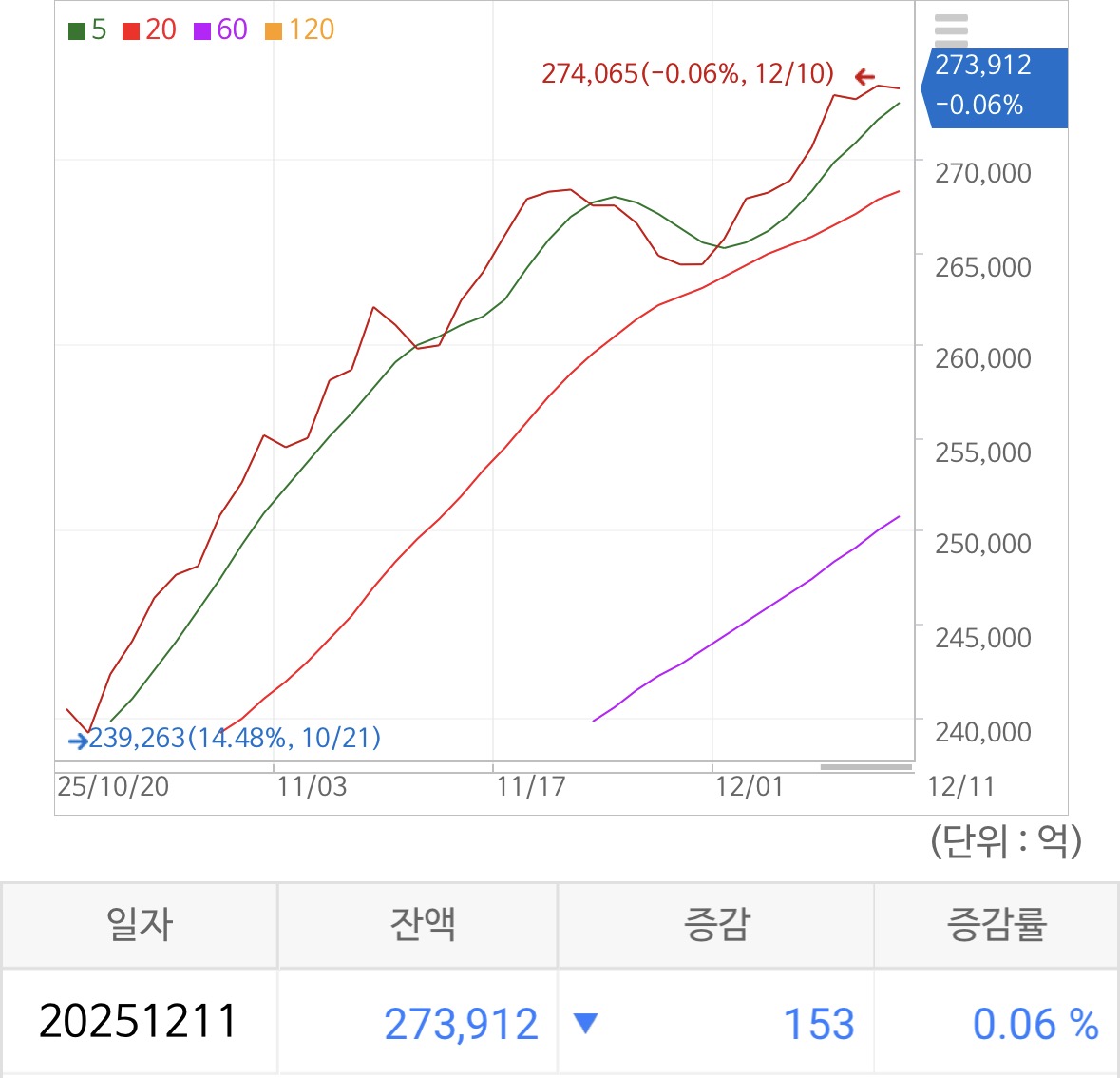 신용 잔고는 27.4조 가량이 되며 0.06% 하락하였음. 보합권의 움직임을 보이는데 오늘은 어떻게 될지 지켜봐야 할 듯.