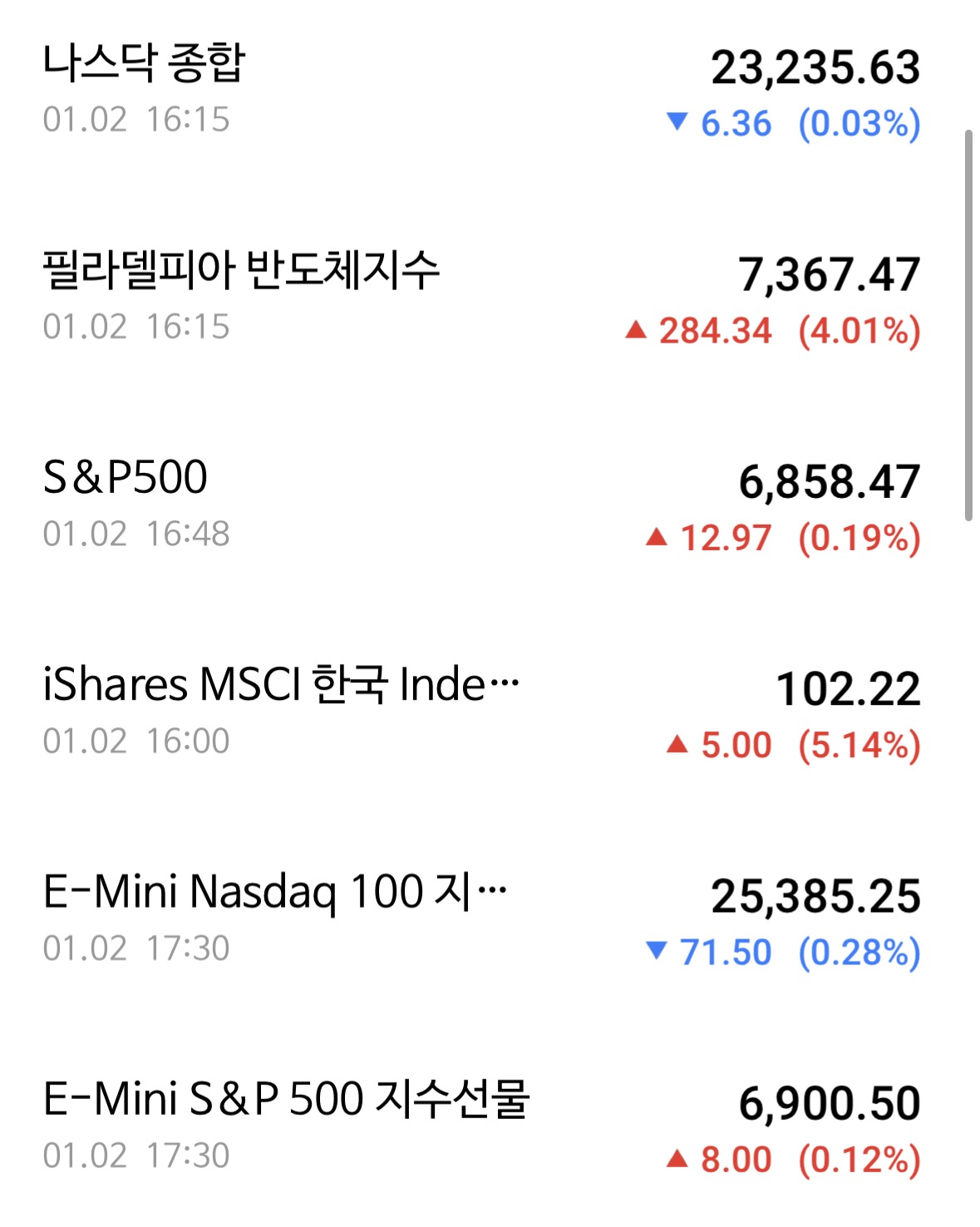 * 나스닥은 0.03% 하락하였음. 테슬라가 2.59% 하락, 팔란티어가 5.56% 떨어지고 있었는데 마이크론이 10.51% 상승하면서 버텨주고 있음. 특히 오늘은 주말간 벌어진 베네수엘라쪽 뉴스도 적용되어야 하니 예측을 하기가 어려운 듯.