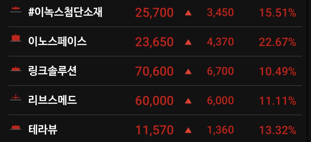 * 이노스페이스 (▲22.67%), 쎄트렉아이 (▲16.12%): * 미국 스페이스X의 상장 가시화 보도로 글로벌 우주 산업의 밸류에이션이 재평가(Re-rating)되고 있습니다.